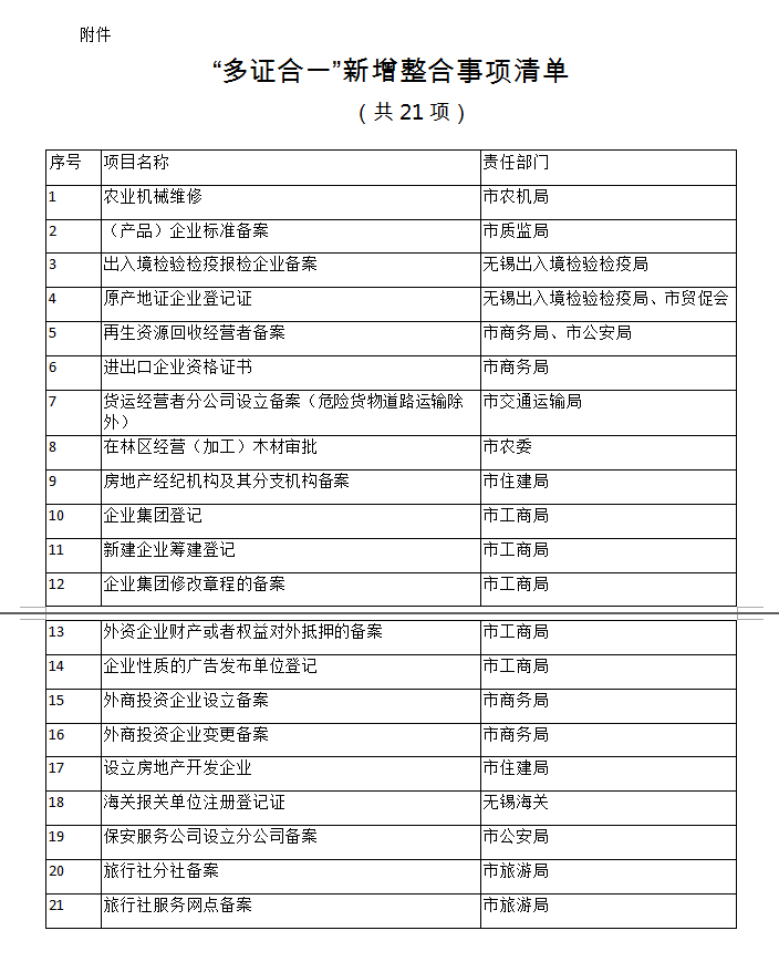 1.按照国务院“能整合的尽量整合、能简化的尽量简化、该减掉的坚决减掉”的原则,全面梳理、分类处理涉企证照事项。在工商营业执照、组织机构代码证、税务登记证、社会保险登记证、统计登记证和企业公章刻制备案“六证合一”的基础上,进一步加大整合力度,在信息采集、记载公示、管理备查类的一般经营项目以及企业登记信息能够满足政府部门管理需要的 21 个涉企证照事项(详见附件)中,对 1-17 项予以合并取消,实行“多证合一、一照一码”; 18项实现对统一社会信用代码的信息共享;19-21项不再另行赋码,实现对统一社会信用代码的信息共享。