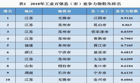 中国县域工业经济发展论坛(2018)发布了2018中国工业百强县(市)、百强区榜单。江阴凭借强大的制造业实力再次位列中国工业百强县(市)第一位。