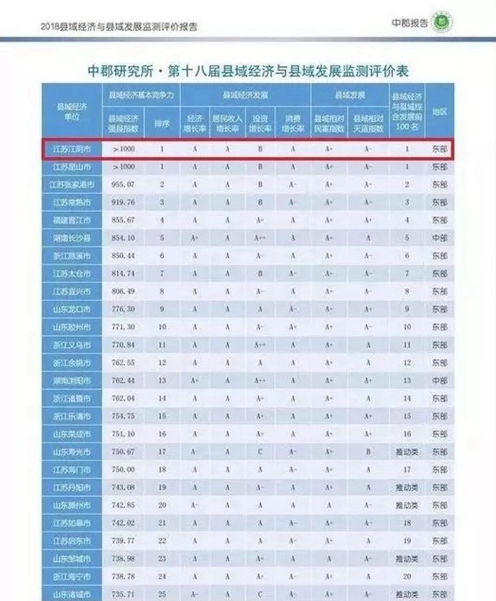 全国县域经济与县域发展专业研究机构、社会智库中郡研究所完成并发布了《2018县域经济与县域发展监测评价报告》,江阴再次蝉联全国县域经济和县域综合发展第一名!实现十六连冠!