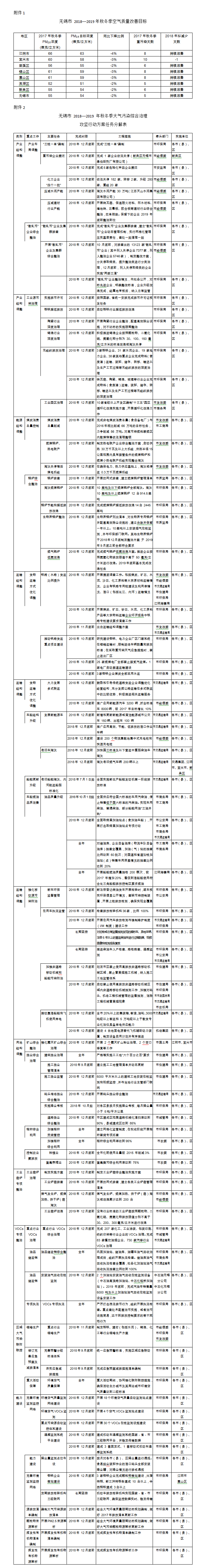 全面完成2018 年空气质量改善目标;秋冬季节全市PM2.5浓度控制在54微克/立方米以下,重污染天数持续改善;江阴市PM2.5浓度同比下降4%,宜兴市、锡山区、惠山区PM2.5浓度同比下降3%,梁溪区、滨湖区、新吴区 PM2.5浓度同比下降 2%;宜兴市重污染天数减少1天,其他地区持续改善。