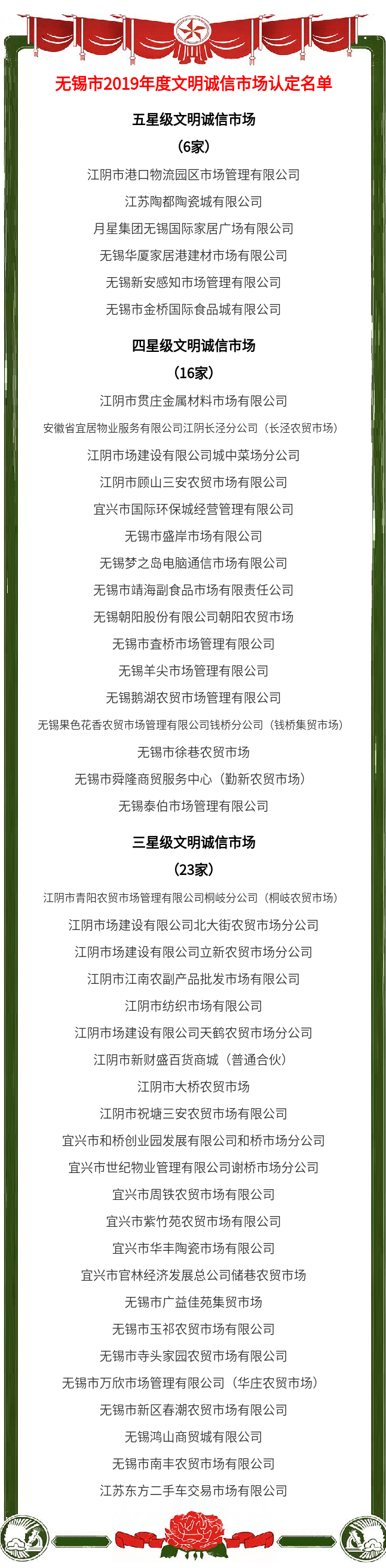 在市场申报、市公共信用信息中心信用审查、文明诚信市场评审委员会办公室审核以及现场检查验收基础上,根据疫情防控形势要求,组织评审委员会各成员单位对拟认定的文明诚信市场进行不见面评审,最终认定2019年度文明诚信市场共45家(其中五星级6家、四星级16家、三星级23家),同步组织公告、授牌。