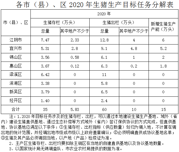 第一条 2020年,全市恢复生猪生产目标任务为生猪存栏35万头、出栏60万头、新增生猪生产产能15万头。市委、市政府将恢复生猪生产目标任务列入2020年高质量发展考核,各市(县)、区要将目标任务进一步细化分解,落实到乡镇和养殖场。对完成地产生猪生产目标任务(锡政办发〔2019〕60号文)的市(县)、区,市财政给予一次性奖补1000万元。