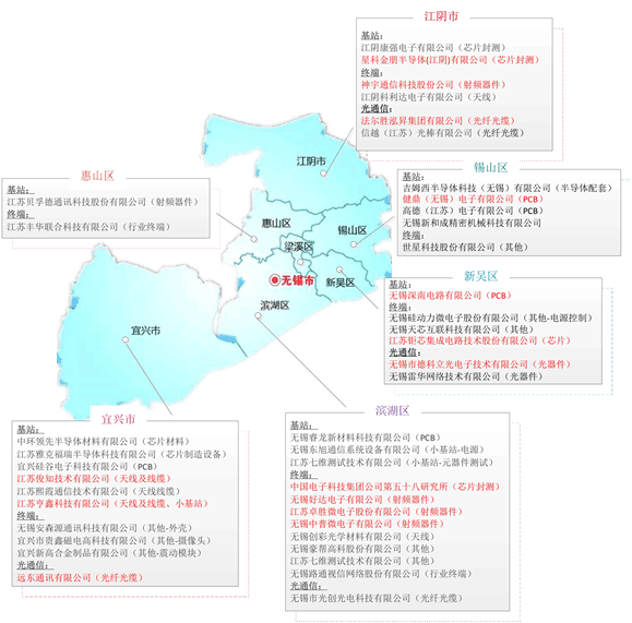 1.优化布局,统筹规划空间协调发展新格局。培育5G产业集群。以新吴区、滨湖区及经济开发区为核心,其他区市协同联动,构建产、学、研、用完整生态体系,加快形成我市5G产业和应用规模发展新格局。基于各市(县)、区现有产业优势,明确5G基础元器件、5G新型模组及终端、5G网络等3个主要产业发展方向,围绕关键领域重点突破,逐步形成协同优势。江阴市重点提升光纤光缆的产业水平,宜兴市重点推进5G天线的产业发展,梁溪区重点构建5G应用的示范样板,锡山区重点增强PCB的产业实力,惠山区重点打造5G新型终端的产业基地,滨湖区重点推进5G射频芯片产业基地建设及5G网络的创新升级,新吴区重点推动5G新型模组及光模块的产业发展,经开区重点提升5G相关产业的科研实力及5G射频滤波器的产业水平。