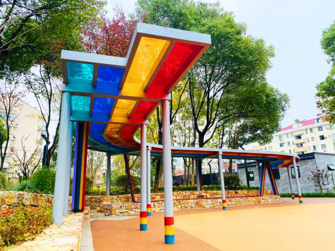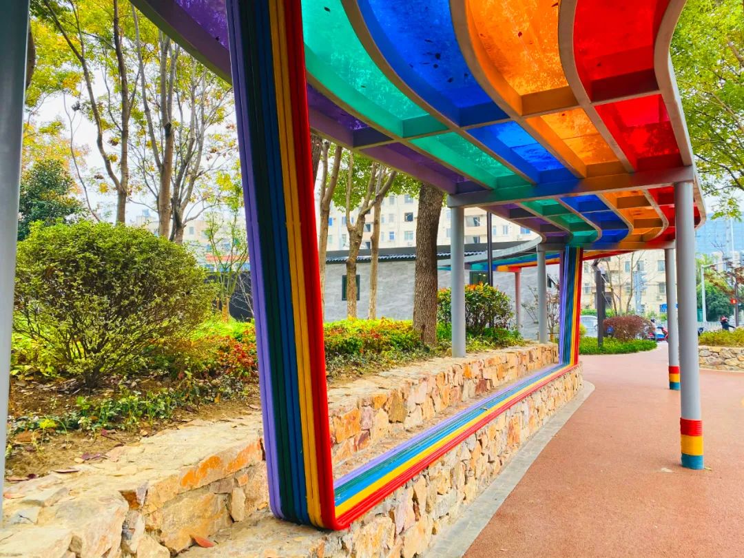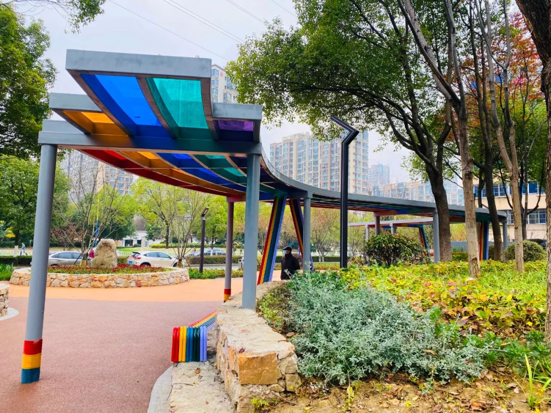 游园中心设置一组由七种颜色组成的钢结构彩虹廊架,廊架长约20米,兼具休憩功能。