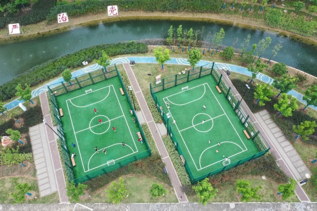 该游园分为南北两侧,北侧包括亲水平台和笼式足球场,沿道两旁设置清正廉洁主题石雕,扫描石雕上二维码,即可收听廉洁故事。南侧游园建设有笼式篮球场和有声党建步道,向广大市民展现红色文化。
