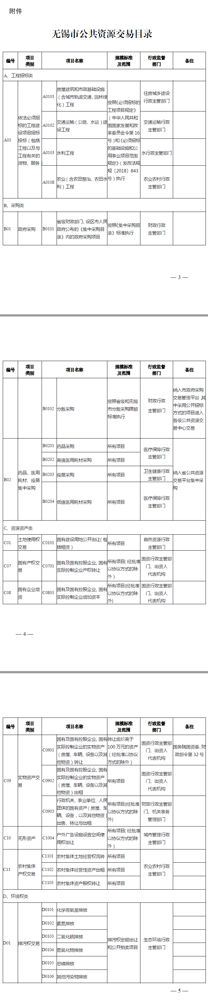 二、《目录》包括四个部分。第一部分是工程招标类交易目录,第二部分是采购类交易目录,第三部分是资源资产类交易目录,第四部分是环境权类交易目录。《目录》实行动态调整,重点围绕公共资源交易领域形势任务,结合政策变化及交易情况,及时调整修订。