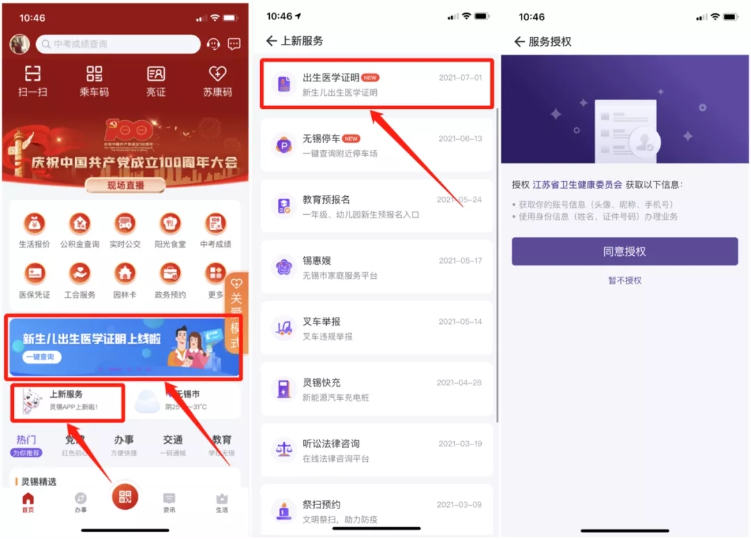 孩子母亲或父亲实名登录“灵锡”APP ,在点击APP首页【出生医学证明】海报页 ,或者点击APP首页 —【上新服务】—【出生医学证明】版块进行查询;