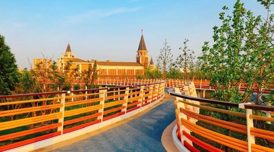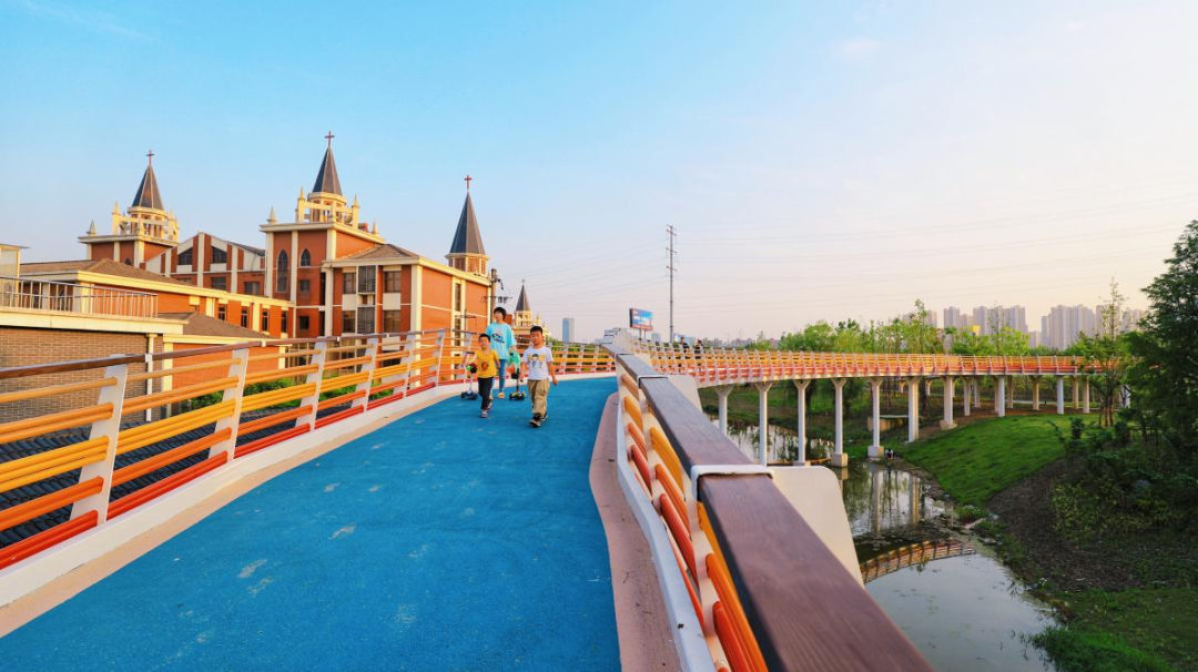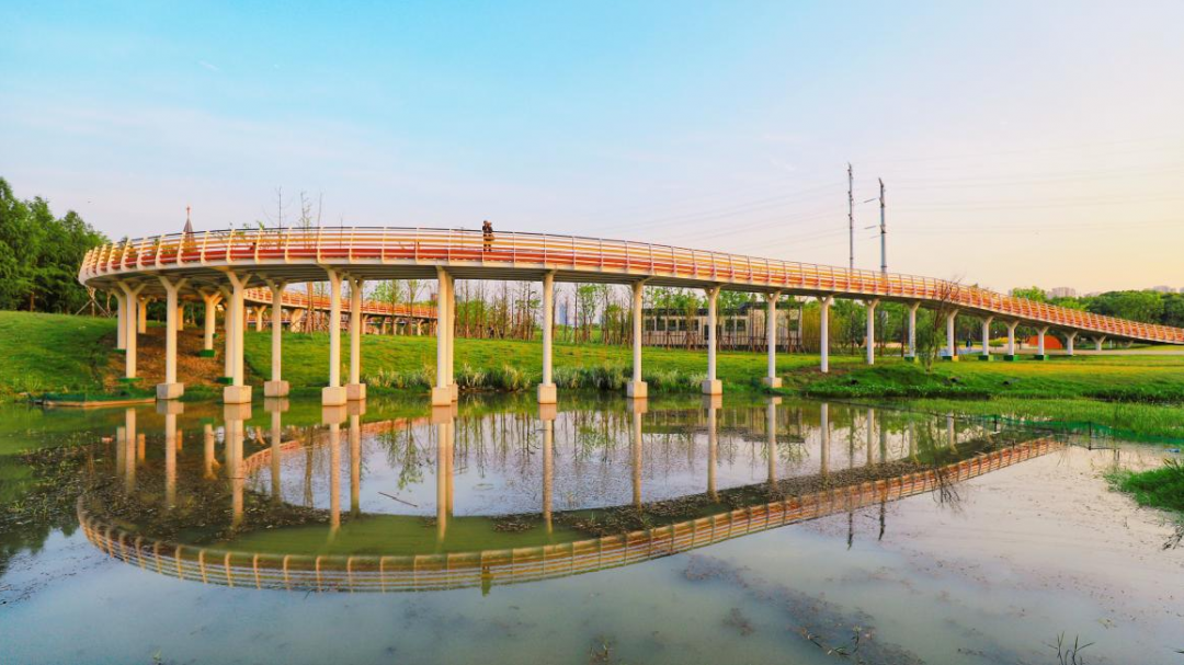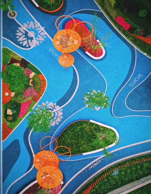 以天空蓝颜色为主基调的健身步道贯穿整个云林生态体育公园,总长2600米,这里可徒步,可骑行,可乐跑。不用加任何滤镜,就能轻松拍出各式美照。