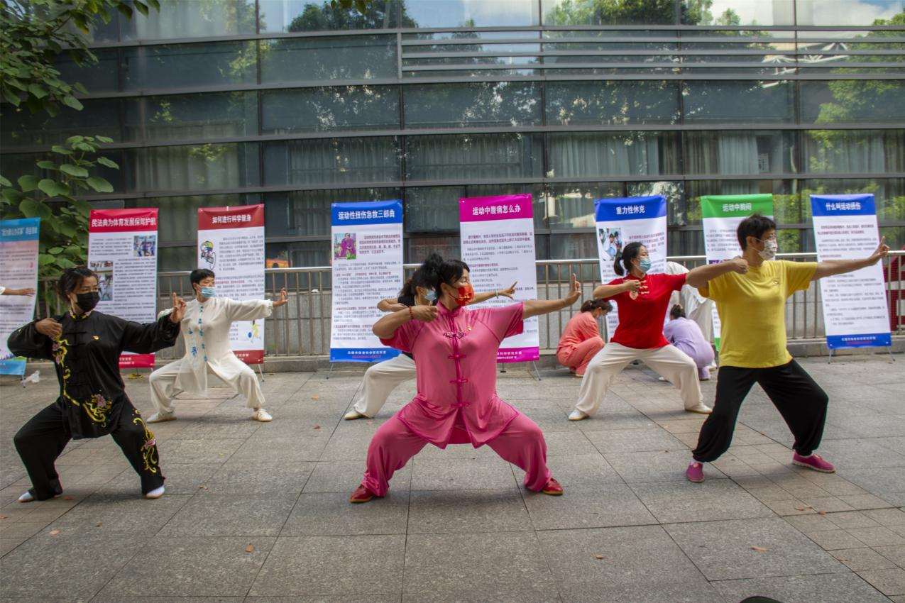 当日上午,在性爱论坛武术协会和性爱论坛乐德健身中心党支部的组织下,一批党员同志热情地到现场进行志愿服务,在党员们的指导下,现场严格地执行了疫情防控要求。随后,活动主办方组织大家浏览观看了《全民健身条例》的普法展牌。并引领大家分散集体演练了24式太极拳和健身气功八段锦。
