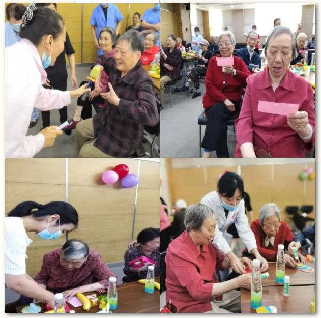 主持人宣布文娱表演开始,一个个精彩纷呈的节目就上演了。开场舞《兰花草》展现了护理员和保洁员热爱生活、热爱运动的精神面貌,她们的舞蹈令台下的老人们仿佛回到了青葱岁月,激发了老人们的热情。 耄耋之年却不服老,老人们随即表演了精彩的节目。在管理老师和护理员的带领下,他们用手语舞《万疆》和歌曲《红梅赞》表达了对祖国的热爱和对幸福生活的满足。“你就是我的天使,保护着我的天使,从此我再也没有忧伤……”,残疾人托养中心的折翼天使们在社工的带领下,组成了一个“梦想海星”乐队,他们用甜美的歌声和节奏明快的鼓声给老人们送上节日的祝福!活动中还穿插了“我画你猜”小游戏和“七彩灯笼”手工制作,让老人们动手又动脑,增加活动的参与度。就像歌中所唱的“最美不过夕阳红”一样,让老人们在养老院真正过上“老有所养,老有所依,老有所乐,老有所安”的幸福晚年生活。