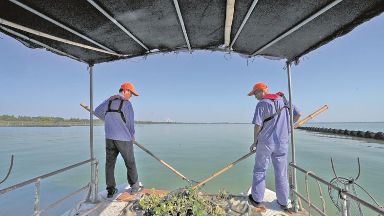 在大溪港蓝藻打捞平台,沈伟遇到了一群同村人。乘上蓝藻打捞船出发,乘风破浪的感觉让沈伟感觉尤为熟悉,仿佛回到了童年快乐的船上生活。同船的周师傅手上打捞工作不停,脸上也满是笑容,他告诉记者:“退捕之后,我们不用风里来雨里去,只要上下班,收入也稳定了。看着这里的湖水一天天变清澈,我们干起活来挺有成就感,生活富足、有意义。”