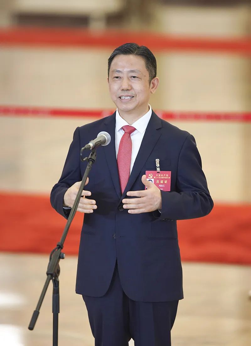 10月22日,中国共产党第二十次全国代表大会闭幕会在北京人民大会堂举行。这是闭幕会后,周海江代表接受采访。新华社记者 才扬 摄