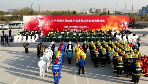 12月15日,2022年性爱论坛危险化学品综合应急救援演练在位于宜兴市官林镇的新材料产业园区危化品停车场举行。