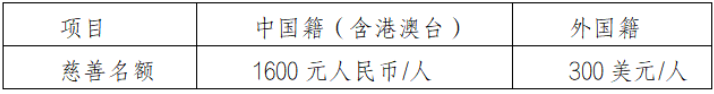 本次赛事马拉松项目开放300个慈善名额,半程马拉松项目开放200个慈善名额,报满截止,选报慈善名额的运动员可直接获得参赛资格。慈善名额2月17日开放报名通道,名额额满即止,报名一经确认,不接受退款申请。慈善名额报名费如下: