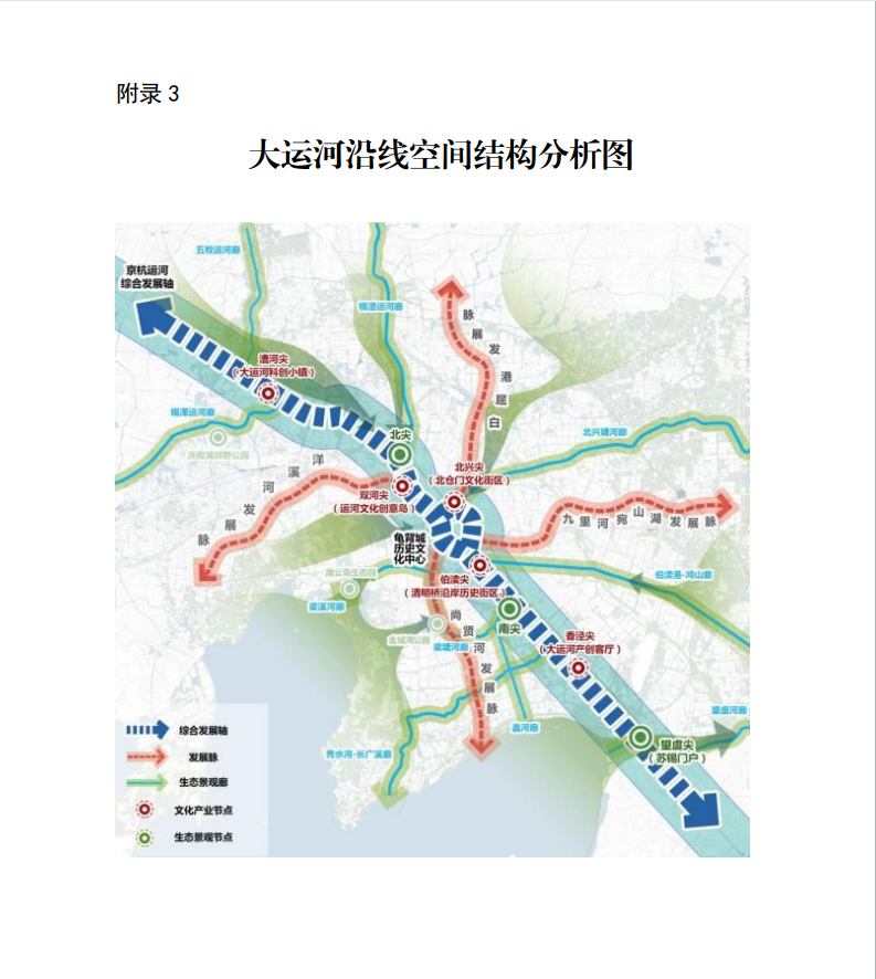 明确“一轴、四脉、十廊、八尖”的空间结构。“一轴”即大运河综合发展轴;“四脉”为白屈港、九里河—宛山湖、洋溪河、尚贤河等4条重要发展脉络;“十廊”为五牧运河廊、锡澄运河廊、锡溧运河廊、梁溪河廊、北兴塘河廊、伯渎港廊、蠡河廊、梁塘河廊、秀水河—长广溪廊、望虞河廊等10条生态景观廊道;“八尖”为漕河尖、双河尖、北兴尖、伯渎尖、香泾尖等5个文化产业节点及北尖公园、南尖公园、望虞尖等3个生态景观节点。