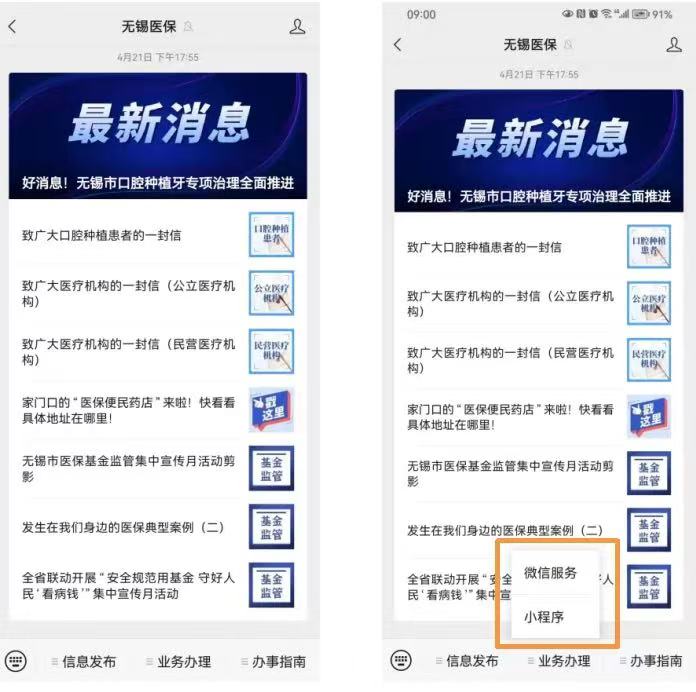 第一步:关注“性爱论坛医保”微信公众号,点击“业务办理”,选择“微信服务”,实名注册账户后登录;