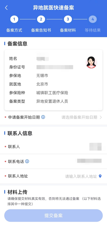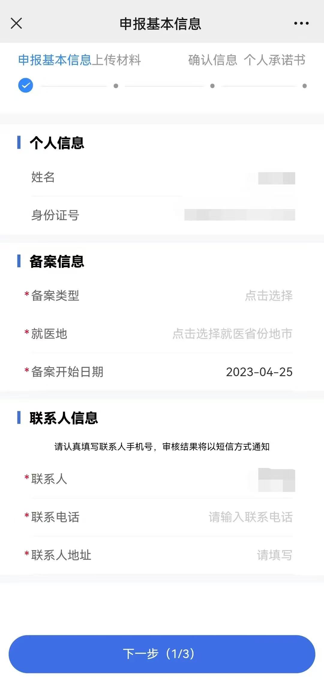 第五步:填写备案信息和联系人信息(选择承诺制备案的,联系人地址要填写就医地详细联系地址,如:xx市xx区xx街道xx小区xx幢xx室),带*为必填项。