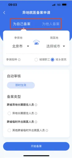 第六步:选择备案类型(下拉框有下列5个选项可供选择)、就医地、备案开始时间一般默认为当天。
