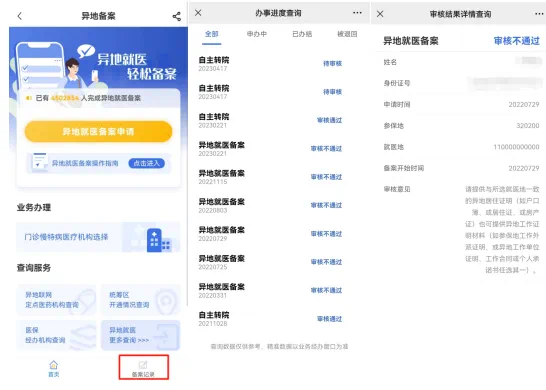 提交备案申请后,可返回“异地备案”板块,点击“备案记录”,显示“审核通过”即办理成功,显示“审核不通过”可点击查看不通过原因。