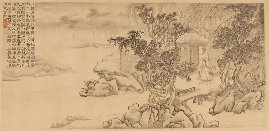 整卷分为四段,分别根据陶渊明《归园田居•其一》《拟古九首•其五》《辛丑岁七月赴假还江陵夜行涂口》《归园田居•其六》四首诗意而作,绘陶渊明持杖出游、访隐听琴、泛舟夜行、种苗归园的情景。画面中山石轮廓线较为粗重,棱角分明,皴染不多,有浙派笔意;而对人物、建筑的处理又颇为细致,笔触细腻,清隽文雅,得吴门派之韵。全卷生动刻画了一位隐士悠然闲适的乡居生活,诗情与画意相融,古朴隽永,意蕴悠长。
