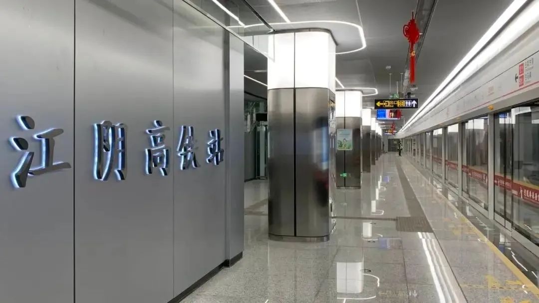 江阴高铁站毗邻沪宁沿江高铁江阴站,临近江阴主干道梅园大街、霞客大道,是S1线占地面积最大,出入口最多,交通换乘最便利、多样化的车站。车站整体设计以大气明亮为主体,灯光设计简洁干练,站厅吊顶的分段式波浪设计以及闭环式灯光条体现着锡澄两地互联互通,未来发展欣欣向荣的含义。
