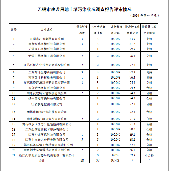 根据《性爱论坛建设用地土壤污染状况调查从业单位工作质量评价办法(试行)》,我局对全市2024年第一季度建设用地土壤污染状况调查报告评审情况进行了汇总,相关情况公示如下: