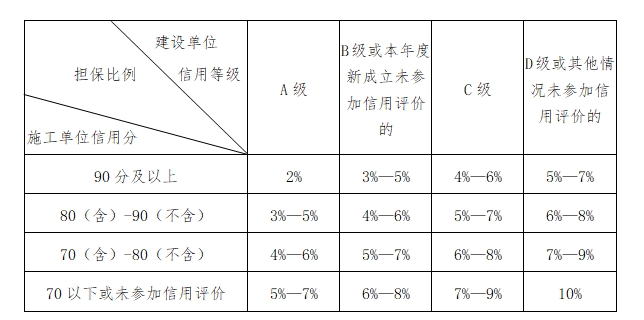 (二)房地产开发项目工程款支付担保根据建设单位和施工单位的信用情况采用分级管理,具体担保比例由建设单位和施工单位按照下表范围在承包合同中约定: