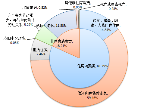 2024年三季度,住房消费类提取金额为54.69亿元,环比下降1.64%,占当季提取额的81.79%。其中还贷提取占比最高,提取金额39.76亿元,占当季提取额的59.46%。具体提取结构如下: