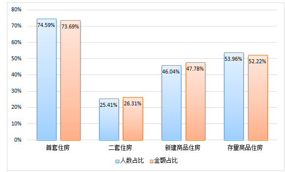 从贷款群体来看,刚需与改善型住房需求职工分别占贷款总人数的29.43%和62.85%。从单位性质来看,以城镇私营企业及其他城镇企业职工为主,贷款笔数和贷款金额占比分别为51.26%、48.34%。从购房面积来看,职工贷款购买90(不含)-120㎡房屋居多,占贷款总人数的36.33%。从主借人缴存基数来看,贷款主要以中、低收入职工为主,分别占贷款总人数的26.39%、72.09%。从贷款类型来看,纯公积金贷款和组合贷款占比分别为59.88%、40.12%。从贷款结构来看,首套住房公积金贷款职工占贷款总人数的74.59%,二套住房公积金贷款人数占25.41%。具体放贷结构如下: