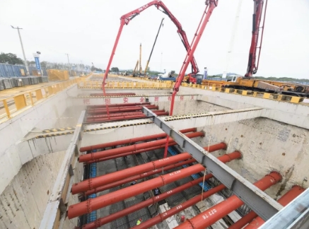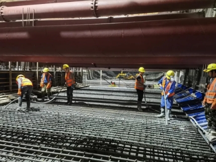 为确保首块底板顺利浇筑,建设团队精心组织、周密部署人力、材料、机械等准备工作,并实施24小时带班制度,全方位推进建设进程。同时,建设团队不断优化运输路线并安排专人疏导交通,确保混凝土供应及时无断链,并且在浇筑过程中严格遵守操作规程,精确控制浇筑厚度与振捣间距,保障混凝土的密实度和整体质量,共同推动底板浇筑任务顺利完成。