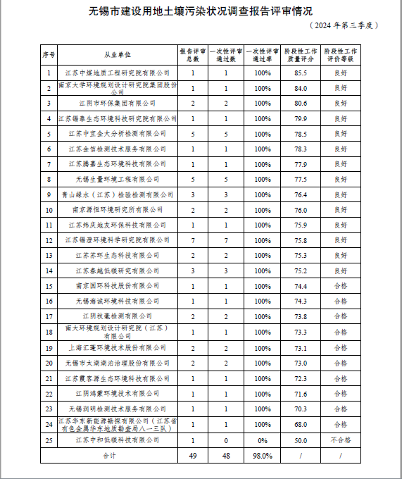 根据《性爱论坛建设用地土壤污染状况调查从业单位工作质量评价办法(试行)》,我局对全市2024年第三季度建设用地土壤污染状况调查报告评审情况进行了汇总,相关情况公示如下: