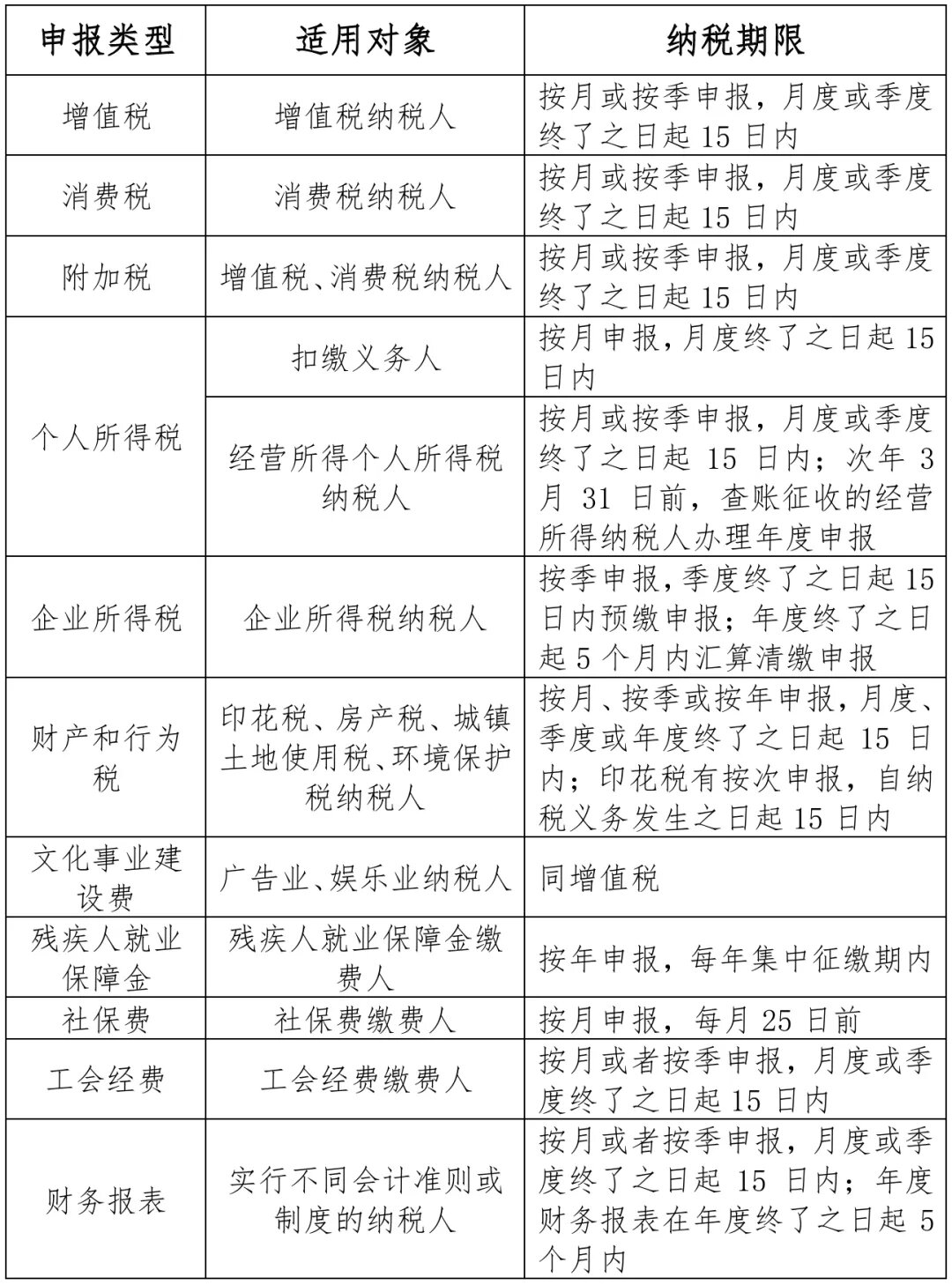 注:申报期最后一日是法定休假日的,以休假日期满的次日为期限的最后一日;在期限内有连续3日以上法定休假日的,按休假日天数顺延(社保费除外)。