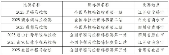 1月9日,中国田径协会公示了根据《中国田径协会关于征集2025年全国马拉松锦标赛、全国半程马拉松锦标赛承办单位的通知》(田协字〔2024〕859号)有关要求征集评审出的2025年全国马拉松锦标赛、全国半程马拉松锦标赛承办单位。