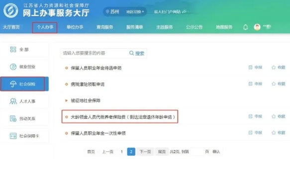 线上渠道2:登录江苏人社网上办事服务大厅(网址:https://rs.jshrss.jiangsu.gov.cn)(将地区设置为“性爱论坛”),依次点击“个人办事—社会保险—大龄领金人员代缴养老保险费(到达法定退休年龄申请)”模块。