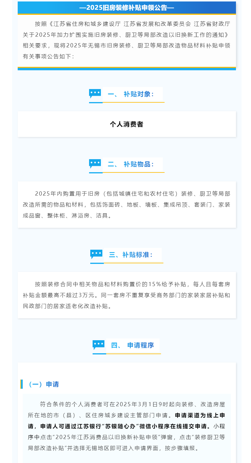 2025年旧房装修厨卫等局部改造物品材料补贴申领公告