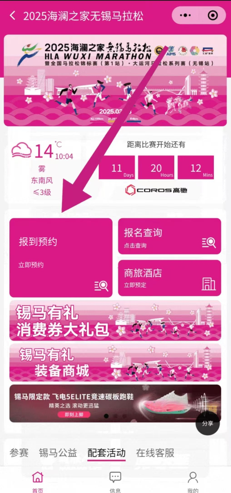 1. 先预约,后报到。未预约到场将无法领取参赛物品;2. 参赛选手须在锡马「参赛助手」小程序预约报到时段。