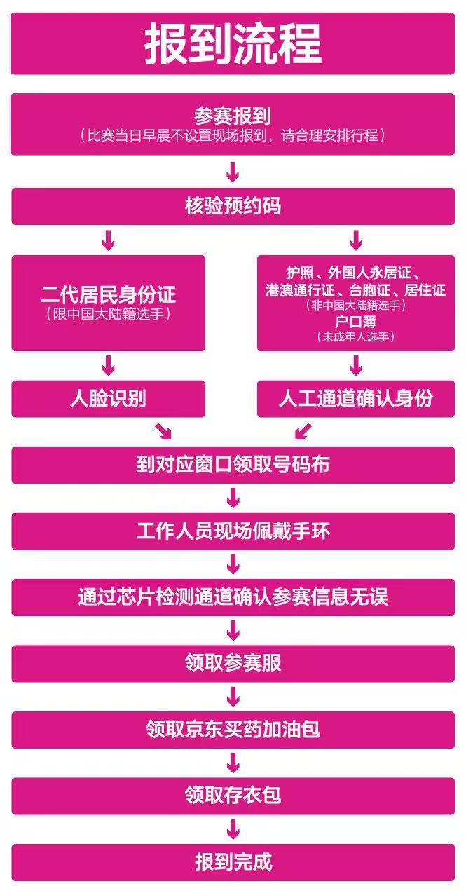 1. 中国大陆籍选手须持二代居民身份证原件;2. 中国香港、中国澳门籍选手须持港澳居民来往内地通行证或港澳居民居住证原件;3. 中国台湾籍选手须持台湾居民来往大陆通行证或台湾居民居住证原件;4. 外籍选手须持护照或外国人永久居留身份证原件;5. 18周岁以下未成年选手,须由其监护人或者法定代理人持监护人证件原件、身份证或户口簿原件,携选手本人办理报到手续。*请确保所持证件在有效期内,并与报名填报信息一致。无上述证件原件者,将拒绝为其发放参赛物品。