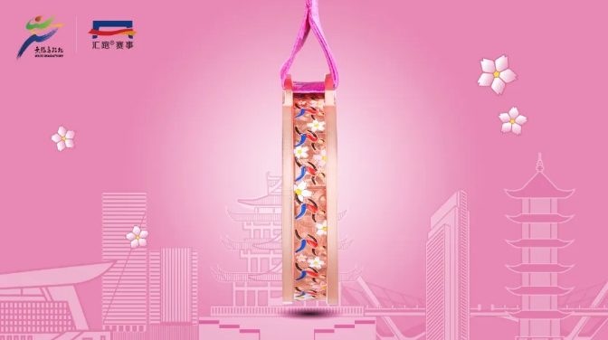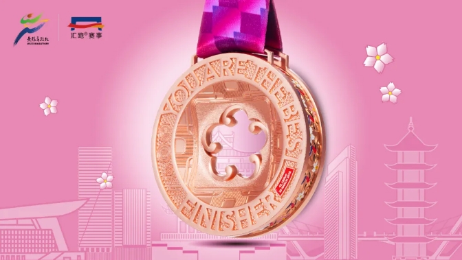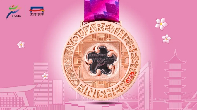 旋转至奖牌侧面,在精密的蚀刻工艺加持下,呈现近似“珐琅彩”的温润釉面,9对跑者穿梭散落樱花雨中,象征着马拉松的九种核心精神:坚持、毅力、勇气、挑战、突破、成长、蜕变、荣耀、传承。