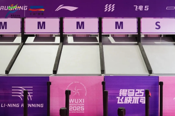 斜面之上,竹节浮雕线条纵横交错,将江南水乡的温婉雅致与锡马的拼搏精神完美交融。外围四座形似拱门的雕刻,既寓意“四方合,成一赛”的办赛理念,又与梅花瓣数“五”相呼应,寓意着锡马对“五湖四海”跑友的热烈欢迎。