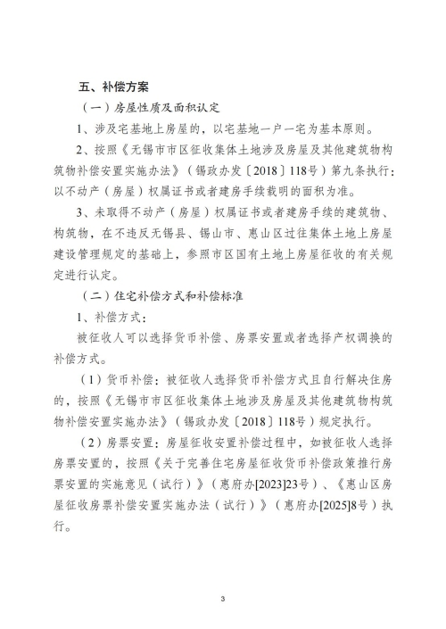 根据《中华人民共和国土地管理法》第47、48条等有关规定,依据惠山区拟征告〔2025〕38号拟征收土地公告和征地社会稳定风险评估结果,结合土地 现状调查情况,惠山区人民政府组织有关部门编制征地补偿安置方案如下: