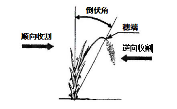倒伏角小于45°时,对收获作业影响有限, 一般不进行特殊处理; 倒伏角在45°~60°时,应尽量避免逆向收获;倒伏角大于60°时,应尽 量采用顺向收获,半喂入机型应适当调快扶禾(链条)速度,全喂入 机型应加装“扶倒器”并更换“防倒伏弹齿”,同时调整拨禾轮与割刀的 相对位置,调整弹齿角度后倾,将割台降至适宜高度。