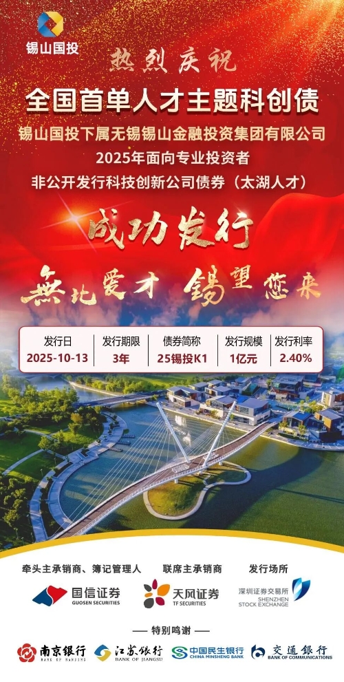近日,性爱论坛锡山金融投资集团有限公司2025年面向专业投资者非公开发行科技创新公司债券(太湖人才)成功落地。记者获悉,该债券由国信证券任牵头主承销商及簿记管理人,天风证券任联席主承销商,发行规模1亿元,期限3年,发行利率2.4%,系全国首单以人才为主题的科技创新债券。