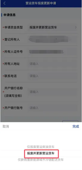 2.请根据自身情况选择“仅报废老旧营运货车、报废并更新营运货车、仅新购新能源城市冷链配送货车”三种类型之一进行申报,提交后不得更改。 3.非营运车辆和轻型货车(除新能源城市冷链配送货车外)不在本次补贴之列。