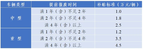 1.报废车辆每辆补贴1万-4.5万(详见表1),新购车辆每辆补贴2.5万-9.5万(详见表2)。