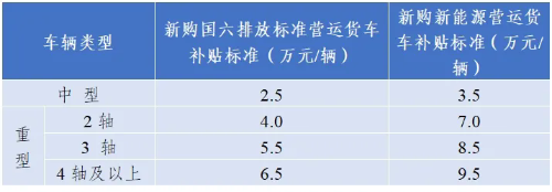 3.对距离强制报废年限不满一年的国四及以下排放标准营运货车实施报废,并新购中重型国六排放标准货车或新能源货车的,按照新购补贴标准予以补贴;对挂车不予补贴。