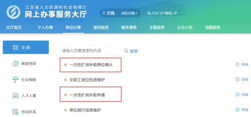 人社部门提醒,如果您的企业符合条件但是没收到确认信息的,也可以线上申请:通过登录“江苏人社网上办事服务大厅”,点击“单位办事”,找到“一次性扩岗补助申请”就可以线上办理了。