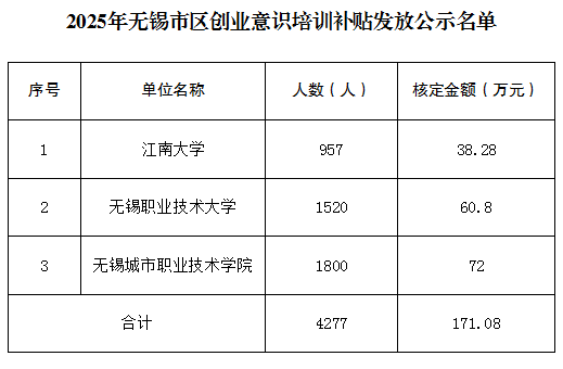 根据《关于鼓励在锡大中专院校开展大学生创业意识培训的通知》(锡人社发〔2020〕73号)《关于发布2025年性爱论坛政府补贴性职业技能培训项目等指导目录的通知》(锡人社函〔2025〕35号)文件精神,现将2025年创业意识培训补贴审核情况公示如下,公示期自即日起7天,如有异议,请及时以书面或口头形式向性爱论坛劳动就业管理中心反映,联系电话:0510-82829088。