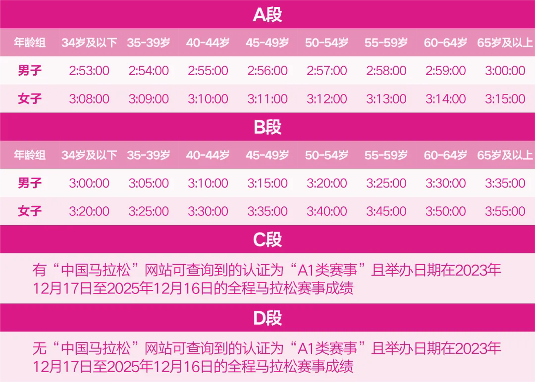 所有报名马拉松项目的选手,根据其“中国马拉松”网站可查询到的认证为“A1类赛事”且举办日期在2023年12月17日至2025年12月16日的赛事中,马拉松项目最好成绩达到如下成绩标准的分别进入各抽签段。