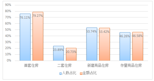从贷款群体来看,刚需与改善型住房需求职工分别占贷款总人数的27.03%和65.92%。从单位性质来看,以城镇私营企业及其他城镇企业职工为主,贷款笔数和贷款金额占比分别为59.83%、58.44%。从购房面积来看,职工贷款购买90(不含)-120㎡房屋居多,占贷款总人数的41.73%。从主借人缴存基数来看,贷款主要以中、低收入职工为主,分别占贷款总人数的27.09%、71.27%。从贷款类型来看,纯公积金贷款和组合贷款占比分别为36%、64%。从贷款结构来看,首套住房公积金贷款职工占贷款总人数的76.11%,二套住房公积金贷款人数占23.89%。具体放贷结构如下: